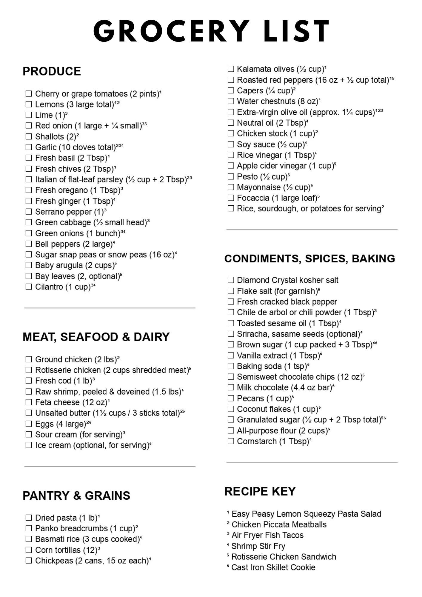 A consolidated grocery list, organized by grocery section
