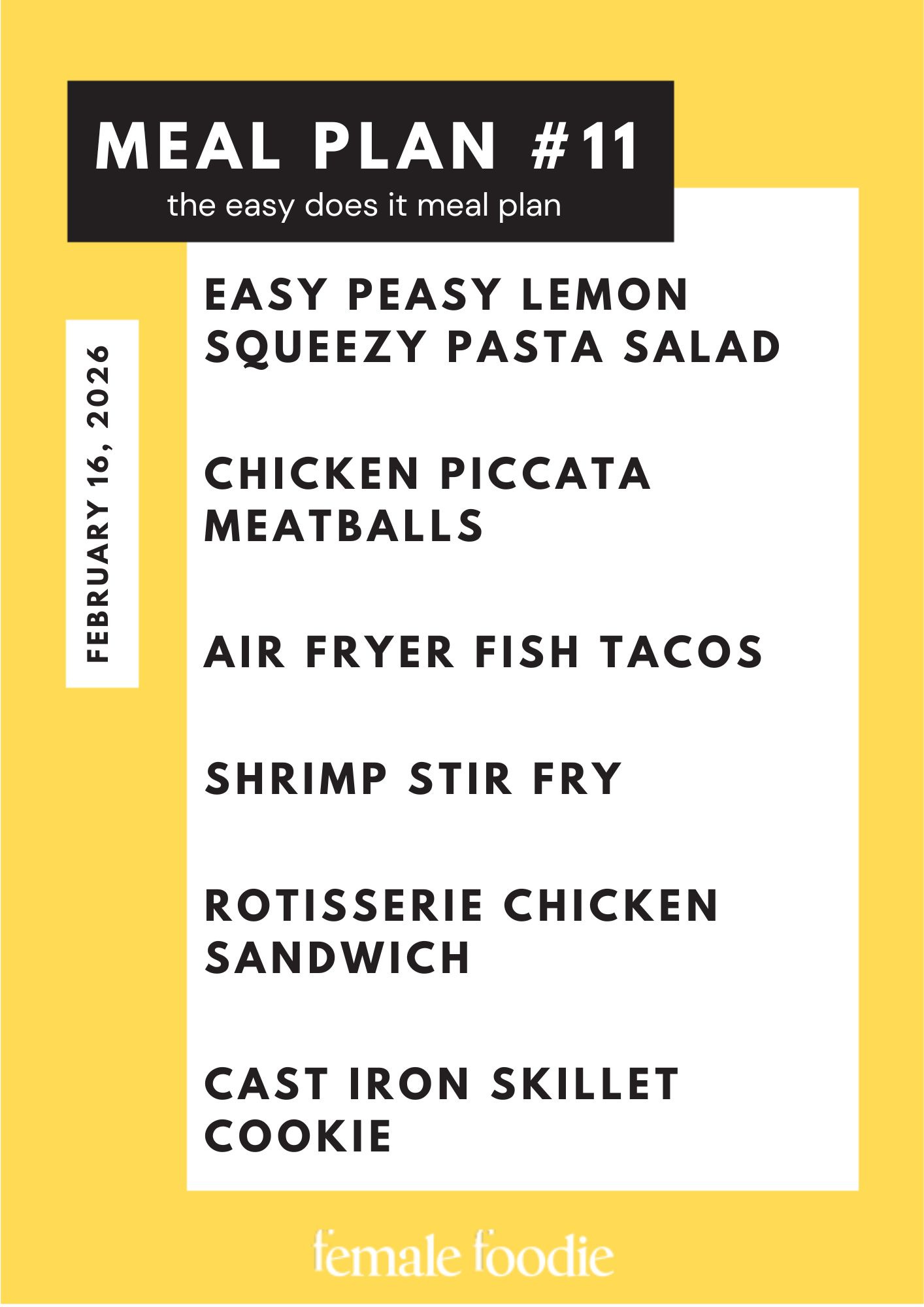 Make the Easy Peasy Lemon Squeezy Pasta Salad at the beginning of the week so you can use it for a quick weeknight dinner (I’m looking at you, sports moms!), or an easy lunch on repeat. Make sure to use a cookie scoop to quickly form your Chicken Piccata Meatballs and bonus points for *doubling* the recipe so that you have enough for this week and another (be sure to store in the freezer). The Air Fryer Fish Tacos can be almost completely prepped ahead of time sans the 10 mins they need to cook in the air fryer or oven. The Shrimp Stir Fry is loaded with juicy shrimp and fresh veggies, but don’t be afraid to swap or use what you have in the fridge! And lastly, the Rotisserie Chicken Sandwich is practically made for February, which you can serve as is or with your favorite soup for the ultimate comfort meal. Our meal plans always come with a COTW (cookie of the week) recipe, and our Cast Iron Skillet Cookie is basically a lazy girl’s cookie recipe because why not have your cake and eat it too?