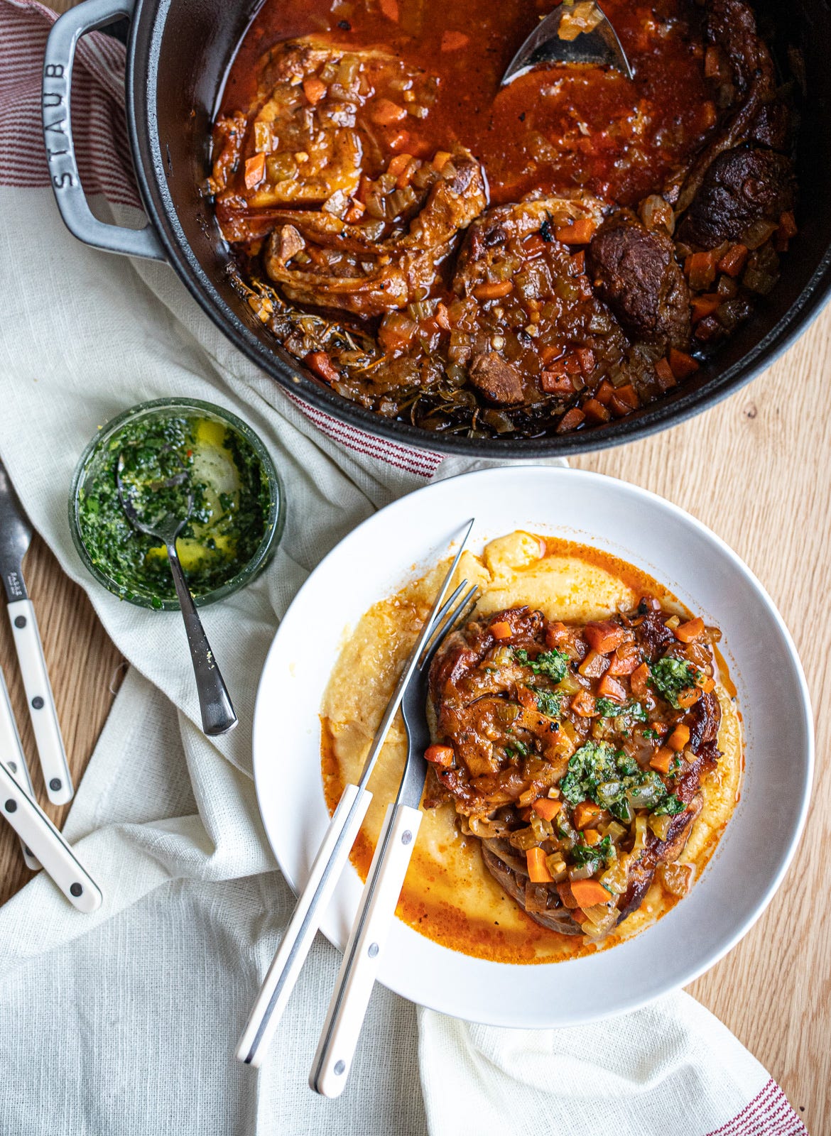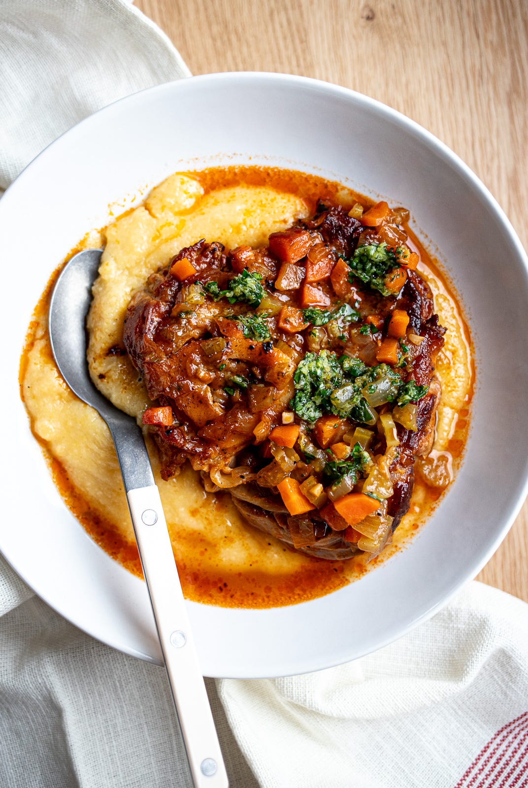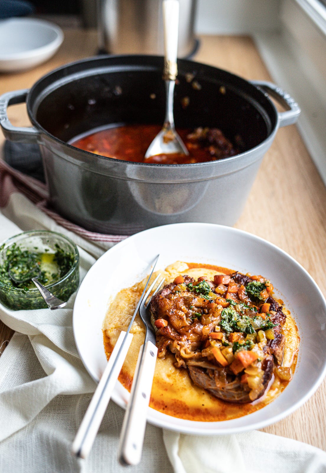 We’re serving it with buttery, creamy polenta to soak up the succulent juices that come from hours of slow cooking the meat. If you aren’t obsessed with polenta yet, I hope this recipe wins you over.