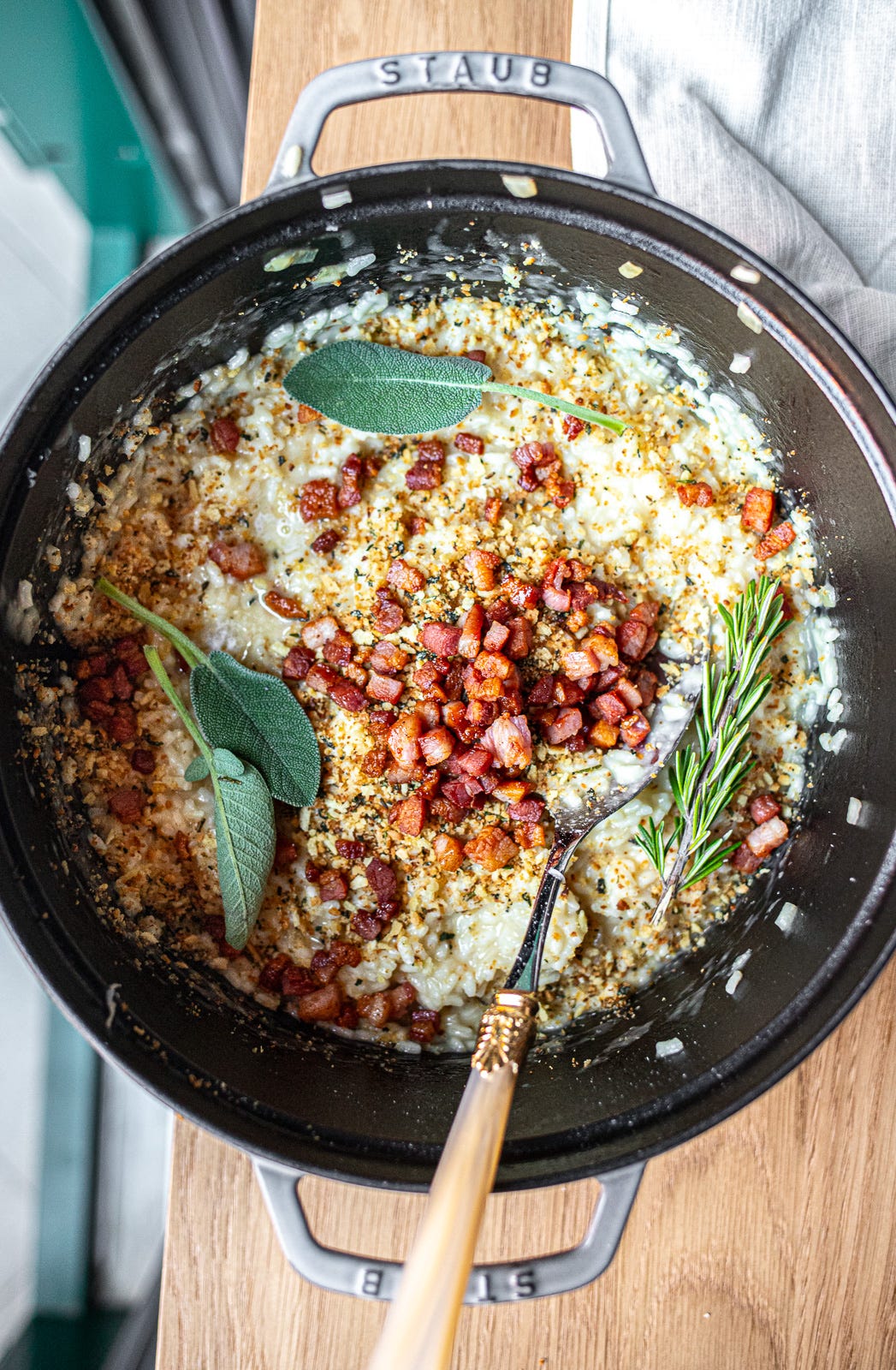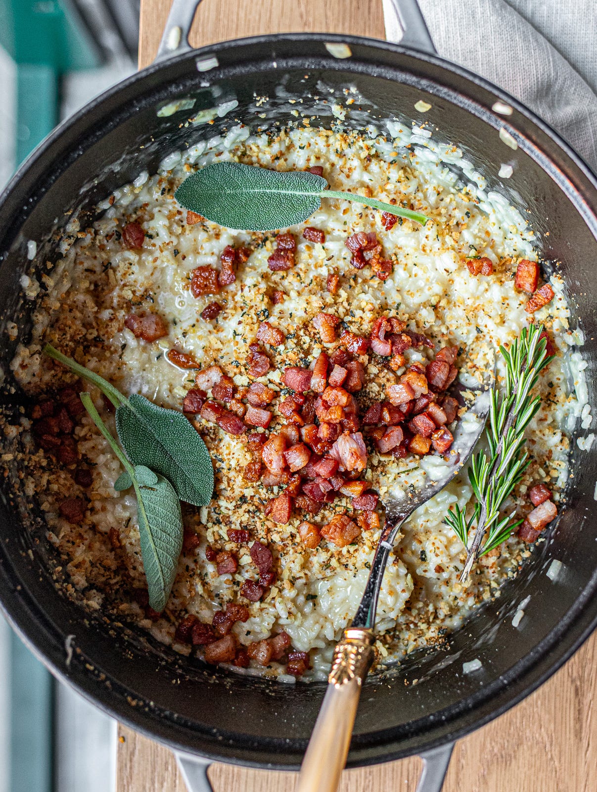 If you’re making this ahead of time, you’ll want to hold off on adding the toasted panko and crisped pancetta until just before serving. Make the risotto as instructed, and when ready to serve warm the risotto slowly and add a few more splashes of chicken stock to re-achieve that creamy, dreamy consistency.